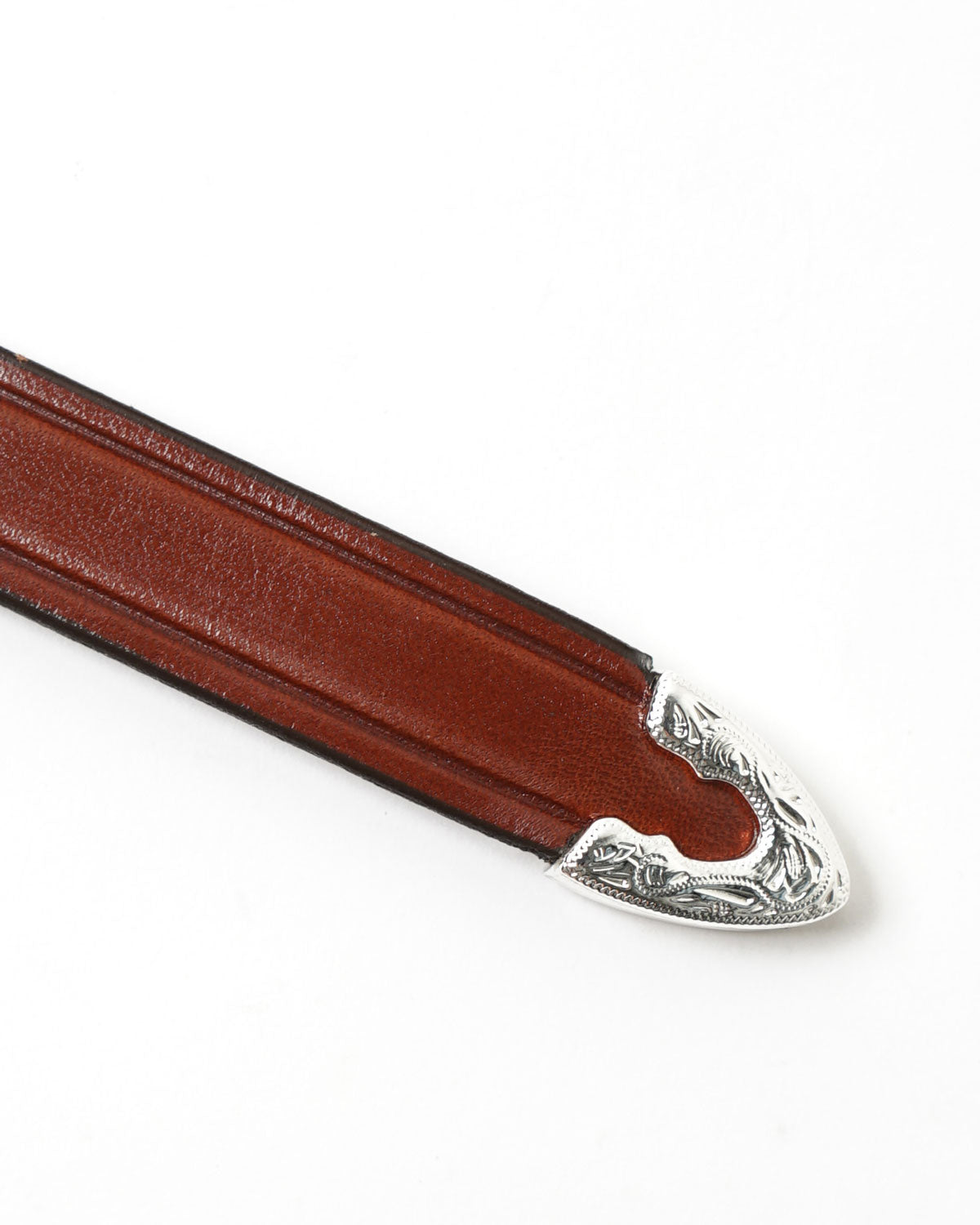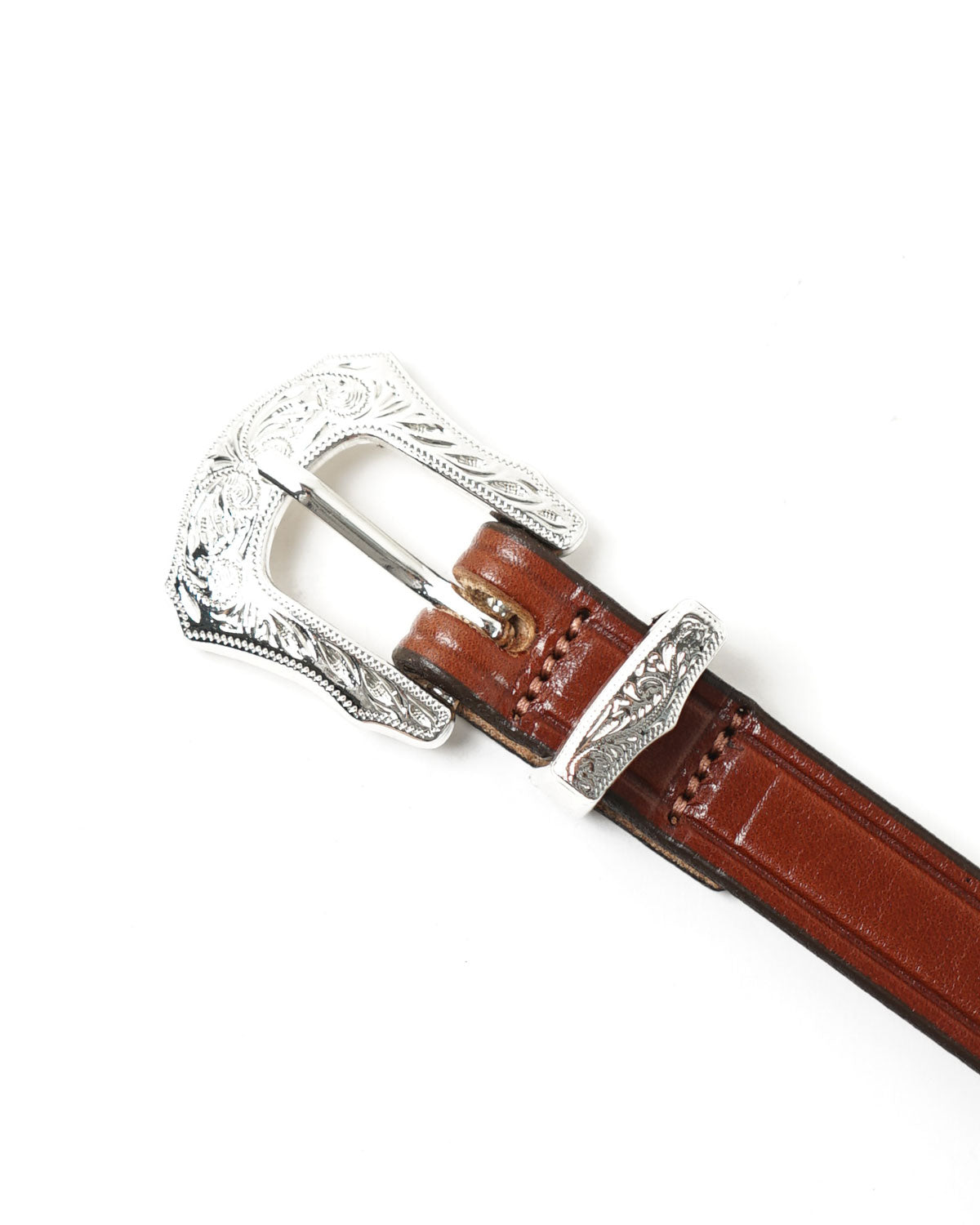 - 3/4" Bridle Leather Silver Buckle Set Belt featuring a three piece silver buckle set. This belt is designed with a sewn buckle closure.